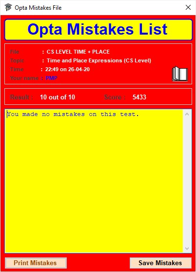 This opens the Opta Mistakes List window which shows details of the test taken in its upper part and a scrollable list of any mistakes made by the user on that test in its lower part.