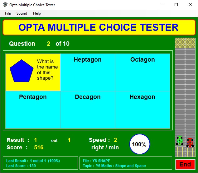The cars on the right of the window indicate your progress through the test; the green one represents yourself, its position along its track depending on how many questions you have answered correctly, and the red one represents an imaginary opponent, its position reflecting partly reflecting the number of questions you have anwered incorrectly.