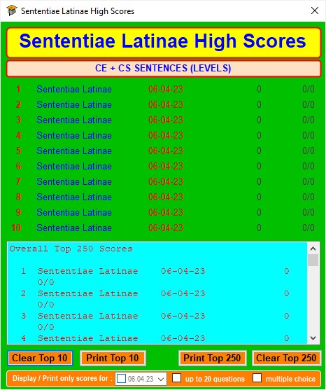 This opens the Sententiae Latinae High Scores window which shows the Top 10 scores in its upper part and a scrollable list of the Top 250 scores in its lower part.