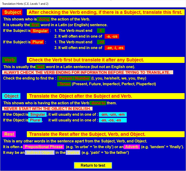 Clicking on the pale yellow Subject, Verb, (Direct) Object, Indirect Object, and Rest column heading boxes will display a hint relevant to the column concerned, if the option Show translation hints has been selected when setting up the test.