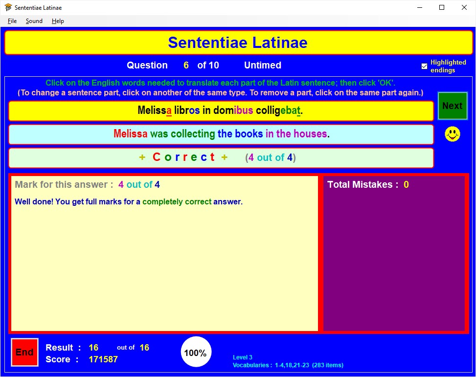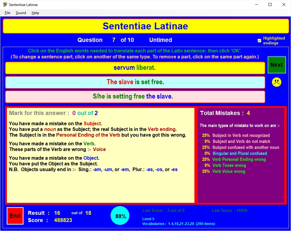When a question is first displayed, the Latin sentence to be translated appears in the yellow box near the top of the window; any grammatical endings will be highlighted in colour (red for Subject, green for Verb, blue for Direct Object, pale blue for Indirect Object, and purple for any other), if this option was selected when setting up the test.