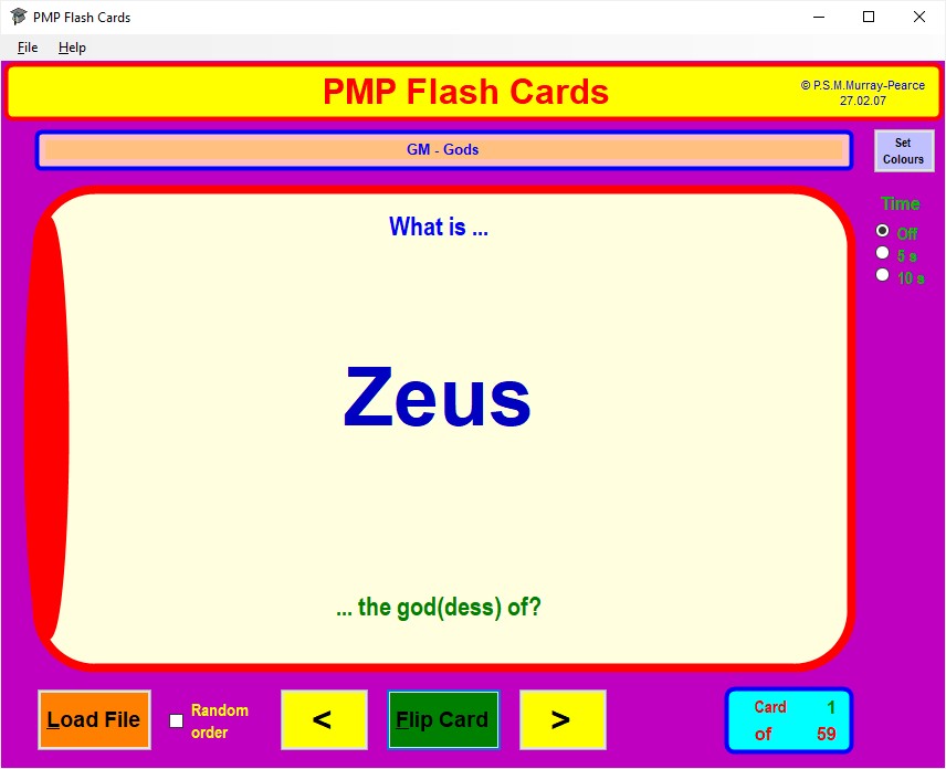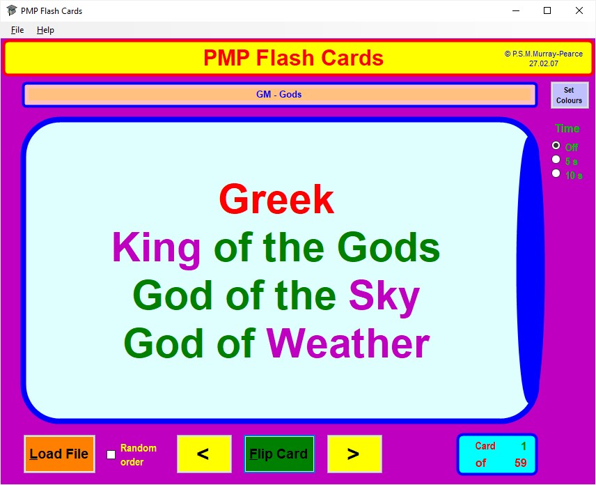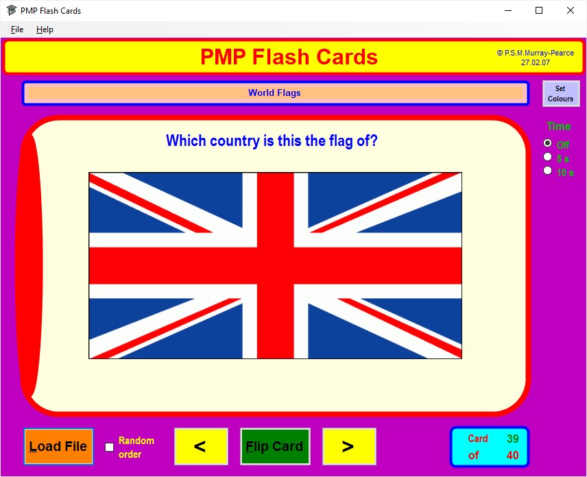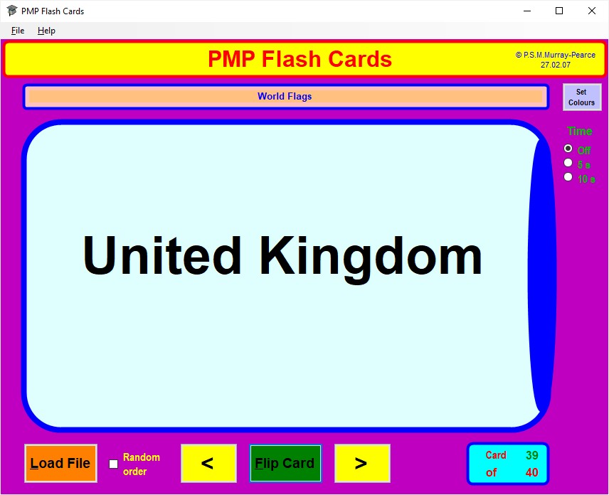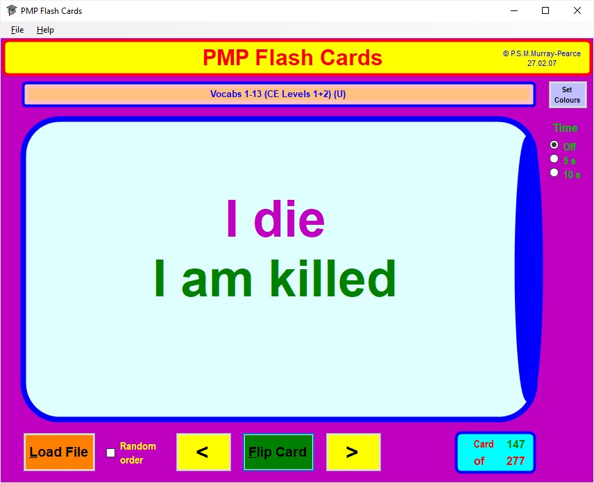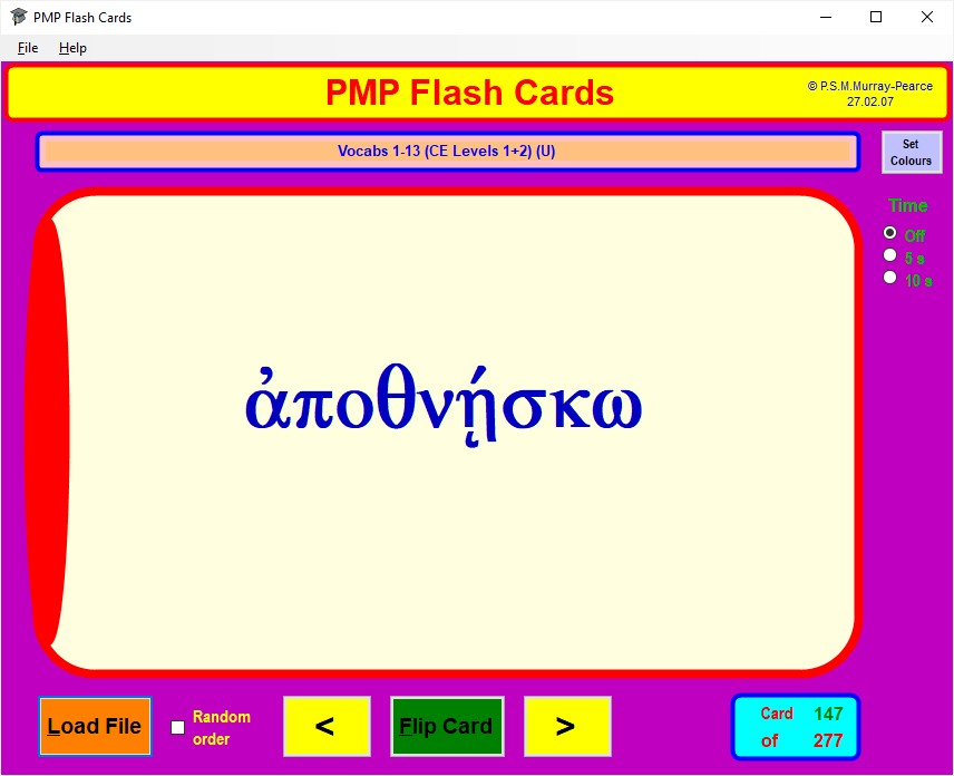 If you prefer the front face of each card to be displayed for a fixed time, perhaps so that you can give yourself a mental test on the review material, click on the appropriate one of the Time radio buttons at the top right to give yourself 5 or 10 seconds per card.