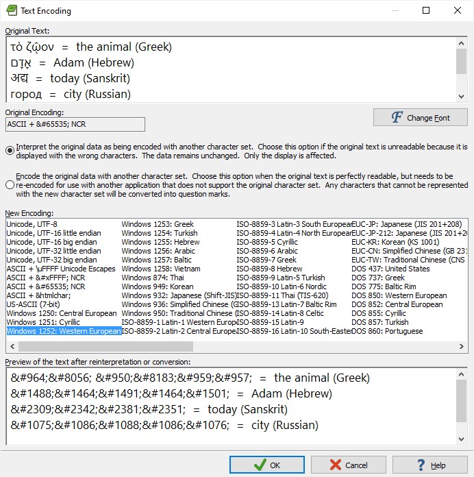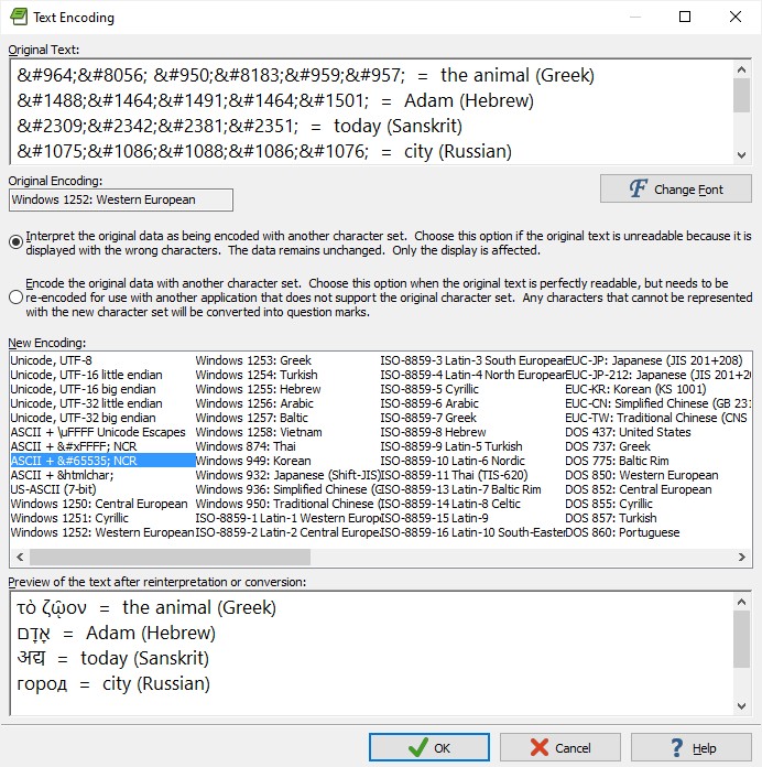 Then convert text encoding to ASCII + 𐀀 NCR (or ASCII +  NCR or ASCII + &htmlchar;) , interpreting the original data, as in the example below, and click OK .