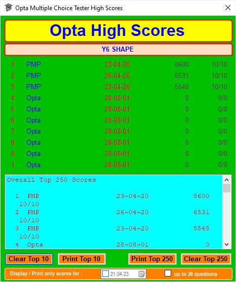 Opta keeps a record of the top 250 scores achieved by users on a particular fact file. This is accessed from the Setup window. Lists of scores can be printed out.