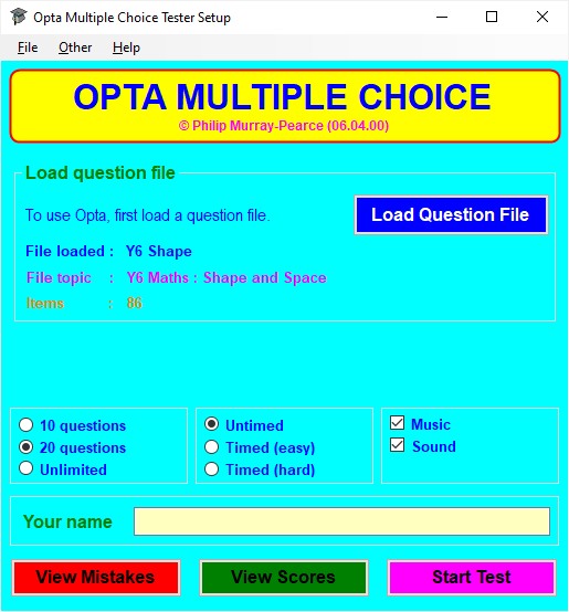 When you press the purple Start button in the Setup window, this window disappears and an Opta Test window, its design depending on the contents of the question file, replaces it.