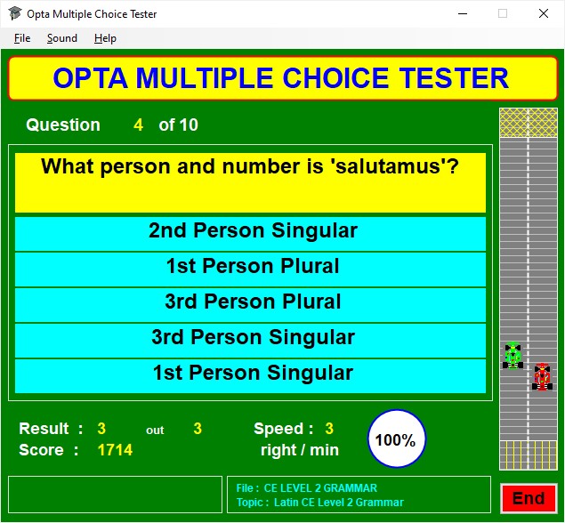 The cars on the right of the window indicate your progress through the test; the green one represents yourself, its position along its track depending on how many questions you have answered correctly, and the red one represents an imaginary opponent, its position reflecting partly reflecting the number of questions you have anwered incorrectly.