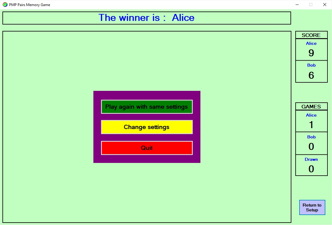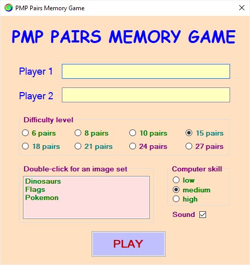 PMP Pairs is a Pelmanism-style memory game using up to 27 images based on any topic.