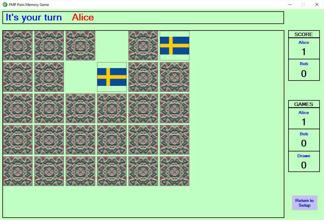 Once you press PLAY, the game window will open, as in the following 15 pairs example:-