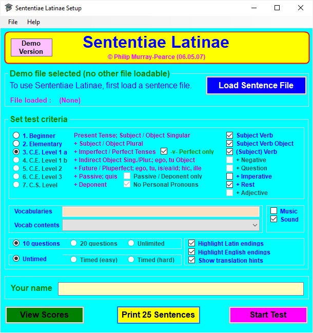 Please note that, if you are using the Demo version of Sententiae Latinae , certain options will be unavailable. In particular, tests may be on Levels 1-3 only and they may have no more than 10 questions .