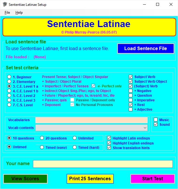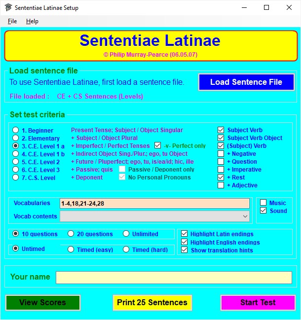If you have the single-user version of Sententiae Latinae, type your name in the box labelled Your name (in the network version, the logon name of the user is entered here automatically).