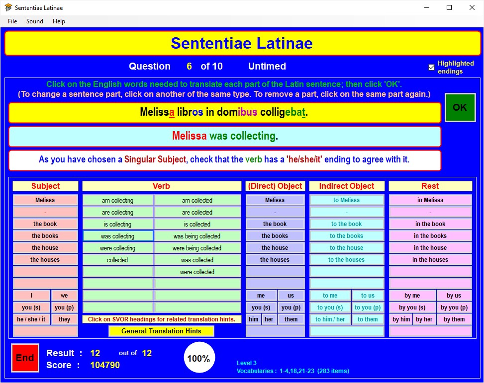 Clicking on the pale yellow Subject, Verb, (Direct) Object, Indirect Object, and Rest column heading boxes will display a hint relevant to the column concerned, if the option Show translation hints has been selected when setting up the test.